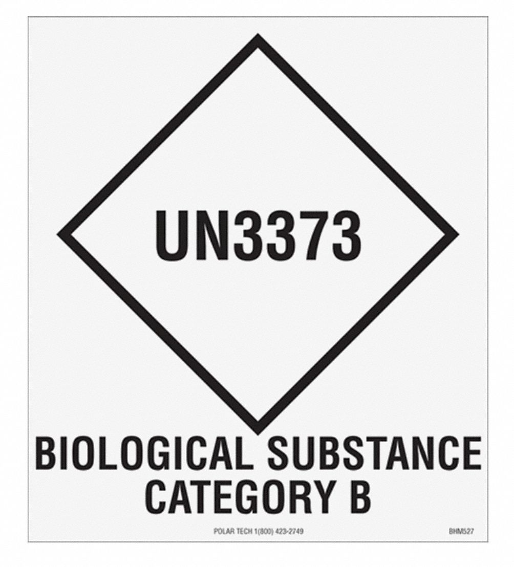 Infectious substances in Category B shall be assigned to UN3373. UN 3373 BIOLOGICAL SUBSTANCE CATEGORY B Figure 1 contains UN number and classification The hazard warning label for category B infectious substances shown below Figure 1 must be affixed to the package. The UNmark must be in the form of a square set at an angle of 45 degrees with each side having a length of at least 50 mm 2 inches.