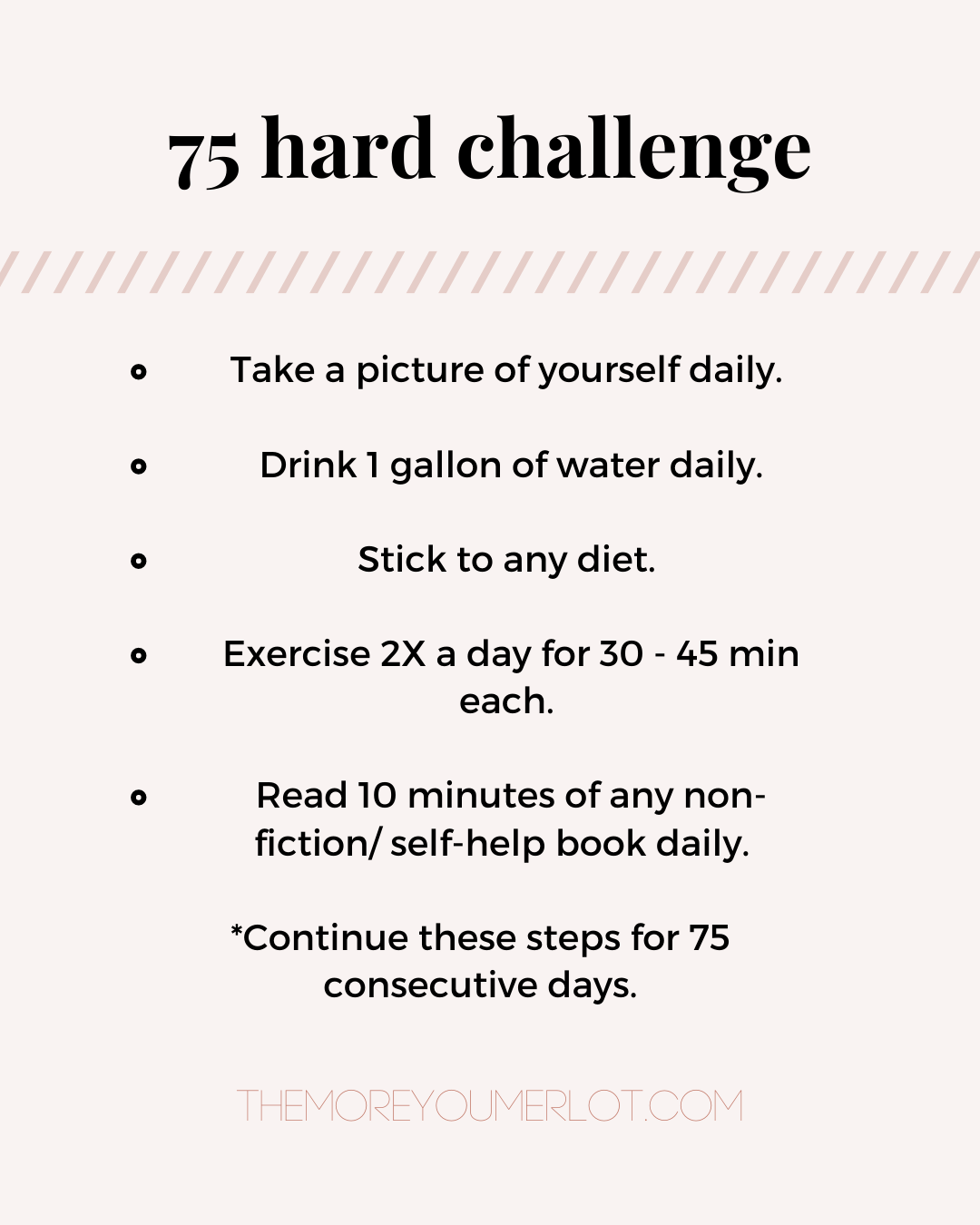 Stick to a diet that I pick. The 75 Hard Challenge is a program lasting 75 days with a simple set of rules designed to build confidence self-esteem and grittiness through a no excuses challenge. You must drink a gallon of water a day.