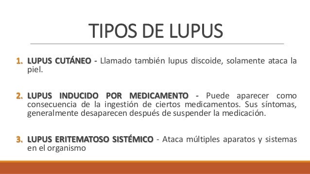Tipos de lupus. No entanto existem estudos que apontam outros desdobramentos da doença apresentando também como um tipo o lúpus por indução de medicamentos. Lupus eritematoso cutáneo crónico. Dolor o inflamación en las articulaciones.