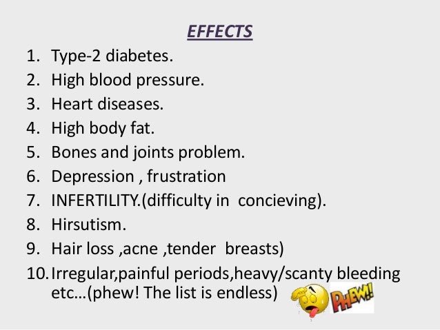 The patient is too psychologically imbalanced to think about these side effects. Women with PCOS are more likely to develop certain serious health problems. Infertility inability to get pregnant.